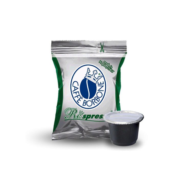 Caffe Borbone Respresso Miscela Verde/Dek. Tipo di prodotto: Capsule caffè, Tipologie di bevande: Caffè, Sistema caffè in capsule/cialde: Nespresso. Peso: 5 g. Tipo di imballo: Scatola. Quantità per pacco: 50 pz