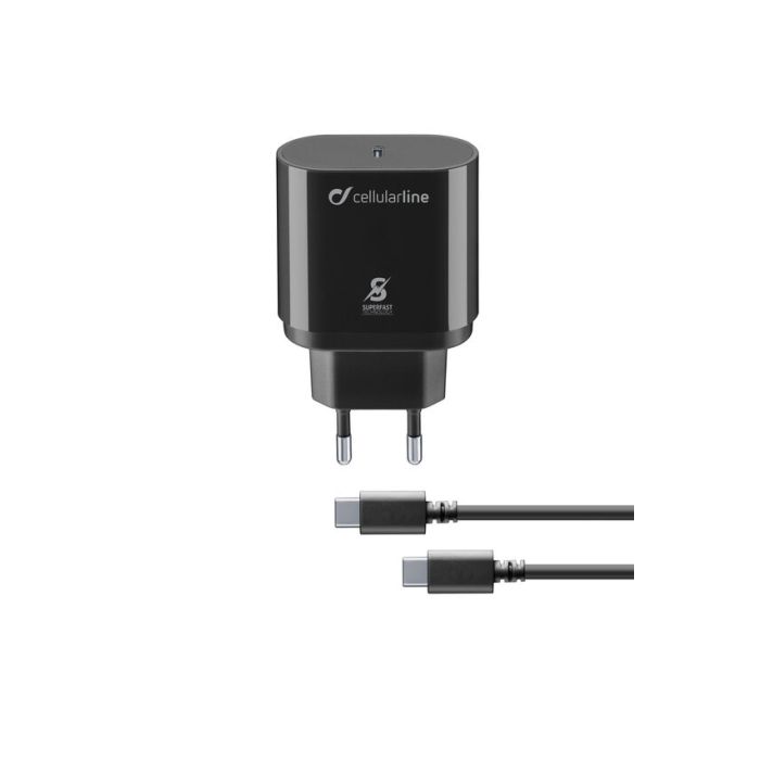 Cellularline Super Fast Charger Kit PD 25W - USB-C - Samsung A70, A80, A90, Note 10, Note 10+ Caricabatterie da rete Super Fast Charge PD 25W con cavo USB-C to USB-C Nero. Tipo di caricatore: Interno, Tipologia alimentazione: AC, Compatibilità caricatore: Smartphone. Voltaggio di ingresso: 110 - 240 V. Quantità di porte USB Tipo C: 1. Lunghezza cavo: 0,1 m, Colore del prodotto: Nero