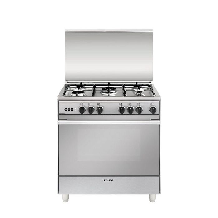 Glem Gas U855VI. Tipo di prodotto: Piano cottura, Colore del prodotto: Acciaio inossidabile, Tipo di controllo: Manopola. Tipo di piano cottura: Gas, Numero totale elementi piano cottura: 5 Fornello(i), Numero di fornelli: 5 Fornello(i). Dimensione del forno: Largo, Sorgente di alimentazione del forno: Elettrico/Gas, Capacità netta del forno: 84 L. Tipo di timer: Meccanico. Classe efficienza energetica: A, Consumo energetico (convenzionale): 2,11 kWh, Potenza aggregata (gas): 2035 W